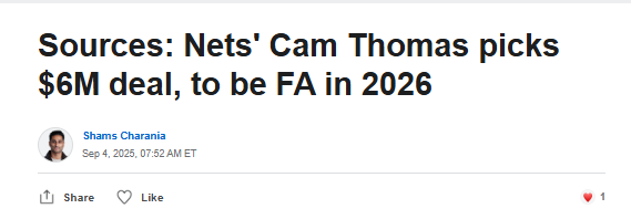 在NBA自由市场仅剩的几位受限自由球员中(包括芝加哥公牛队的吉迪、金州勇士队的库明加、费城76人队的格莱姆斯),托马斯是首位做出决定的球员。消息人士称,托马斯的经纪人团队曾与篮网探讨过多种合约框架,但最终拒绝了篮网提出的两份报价:一份是2年3000万美元且第二年为球队选项的合约,另一份是1年950万美元(含激励条款最高可达1100万美元)但需放弃交易否决权条款的合约。